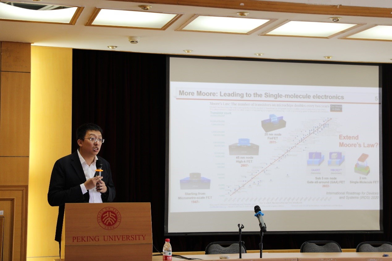 接着,报告从分子电子学历史、近期团队开展的工作、分子电子学在计算中的应用,以及未来发展四个部分展开。从1974年至今,分子电子学的发展已有47年的历史,洪文晶教授带领大家回顾了分子电子学近五十年发展历程中的大事件,并介绍其团队目前的工作目标是利用电化学晶体管实现开态与关态。洪文晶教授说道,其团队曾邀请初高中生来到实验室,在老师的培训和指导下,中学生们也可以实现单分子的精确测量。在谈到分子电子学的未来潜在应用时,洪教授说:“我们发现分子电子器件未来可以作为获取信息的方式,通过单分子电学测量实现化学物质的传感,可以实实在在地给生活带来变化。”洪文晶教授还谈到,分子电子学的计算芯片应用未来还有很长的道路要走,目前其团队也正在思考能否实现分子晶体管的大规模集成。