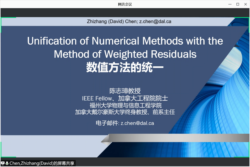 前沿学术论坛第二十三期通过网络顺利举行。本期论坛邀请到IEEE Fellow、加拿大工程院院士、福州大学物理与信息工程学院特聘教授、加拿大戴尔豪斯大学终身教授陈志璋做主题为“Unification of Numerical Methods with the Method of Weighted Residuals (基于加权余量法的数值方法的统一) ”和“中长距离无线能量传输-电磁技术与应用”的学术报告。讲座由六合彩开奖号码