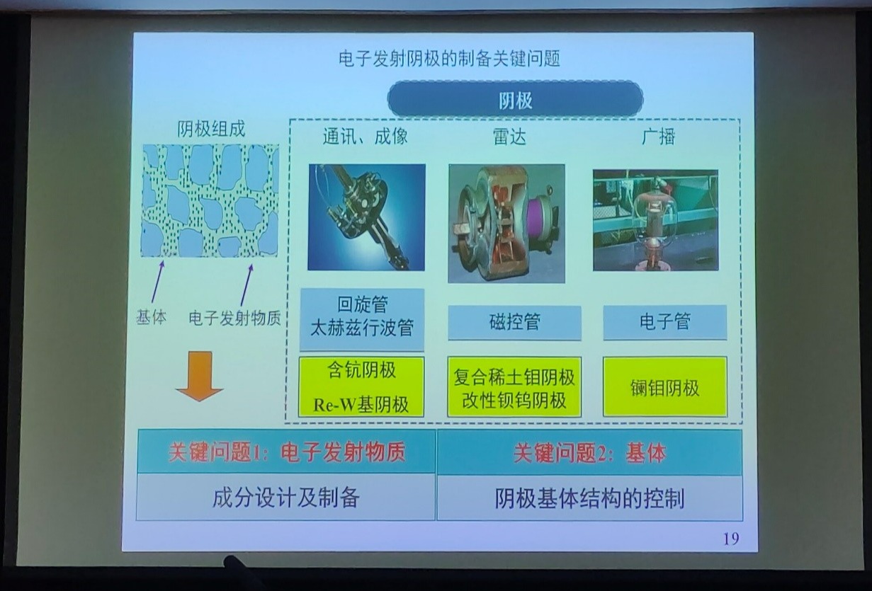 王教授的讲座主要分为三个部分。第一部分,王教授简要介绍了热阴极发展的背景,从服务于国家重大需求的角度强调研究热阴极的重要性,同时指出电子发射阴极制备的两大关键问题:1.电子发射物质的成分设计与制备;2.阴极基体结构的控制。