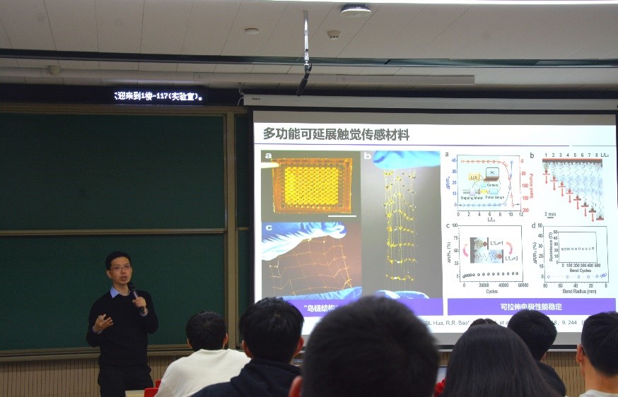 其次,潘教授讲述了触觉传感的实现中所面临的挑战。潘教授将触觉传感制备难点分为三部分:一是人体皮肤不同部位的触觉灵敏度不同;二是人体皮肤面积较大,能到两到三个平方米;三是解决皮肤传感中多物理量的探测精度及串扰问题,同时无串扰地传递温度、湿度、重量等物理量是最难实现的。
