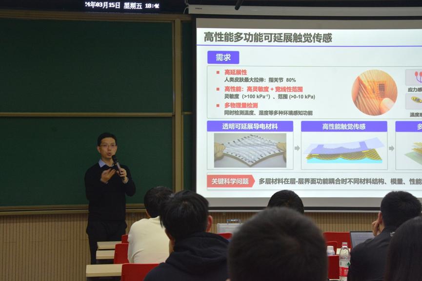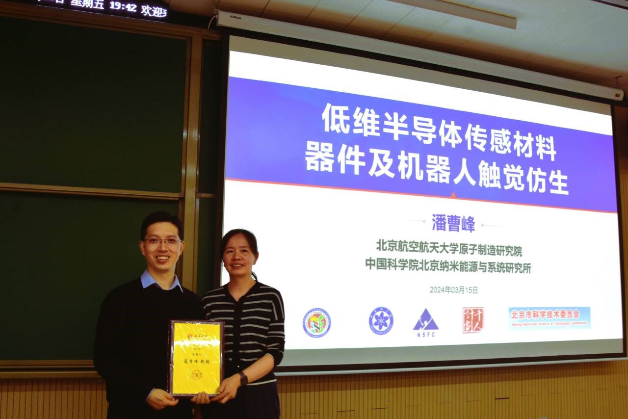 2024年3月15日下午18:30,六合彩开奖号码 前沿论坛第62期在北京大学新燕园校区教学楼117成功举办。本次讲座邀请了北京航空航天大学原子制造研究院潘曹峰教授,为师生进行了主题为“低维半导体材料器件与触觉仿生”的精彩报告。本次讲座由六合彩开奖号码 长聘副教授胡又凡主持,90多名师生到场参与了学术交流活动。