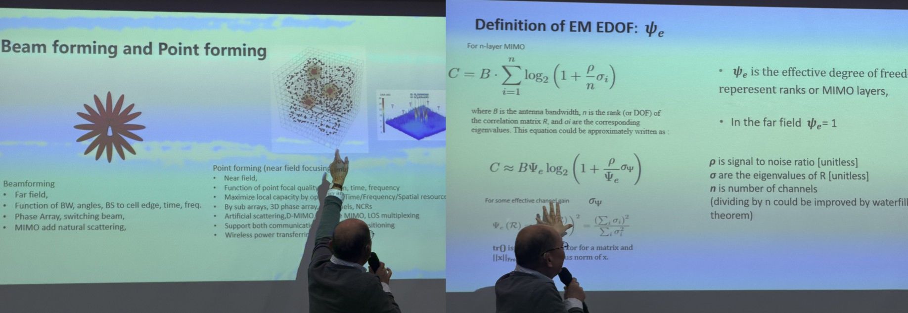 讲座最后,应教授重点解析了分布式MIMO。与集中式架构相比,D-MIMO将接入点在更广区域协同部署,显著改善覆盖均匀性和边缘体验,以空间分集提升容量与抗遮挡能力,在相干协作下进一步带来更均衡的SINR与更稳的业务连续性,适用于园区、室内与复杂场景的精细化覆盖。同时,他指出D-MIMO落地仍面临三类关键挑战:一是高精度同步(相位、时间、频率)在毫米波条件下容错极小;二是前传与计算开销随协作规模增长,需要光纤/射频等多样链路与分布式处理协同优化;三是规模化运维与标定,包括幅相一致性、环境漂移补偿及成本能耗控制。